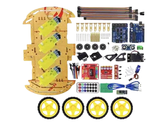 Arduino UNO R3 board, L298N Motor Driver Module, Sensor shield, 4 geared DC motors, 4 wheels, chassis, Ultrasonic distance sensor (HC-SR04), Servo motor, Bluetooth module (HC-05), Line tracking sensors, IR remote control, receiver module, Mini breadboard, jumper wires (male/female), battery holder, USB cable, nuts, bolts, stands, and other mounting accessories.
